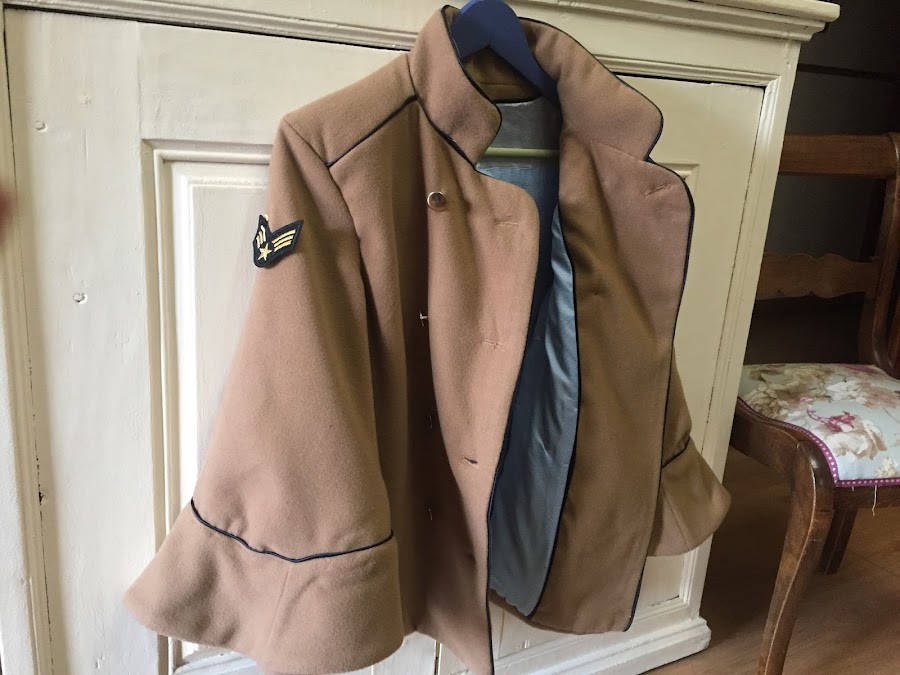 Yo he elegido para hacerla un paño de calidad, muy abrigado y calentito, en color beige, pero he decidido ribetear en azul marino, para el forro elegí un forro de rayas en marino, quería darle un toque marinero a mi chaqueta, aunque luego pensé que tal vez con los botones dorados y el parche era más bien militar, aunque según la hacia iba viendo también toques circenses...