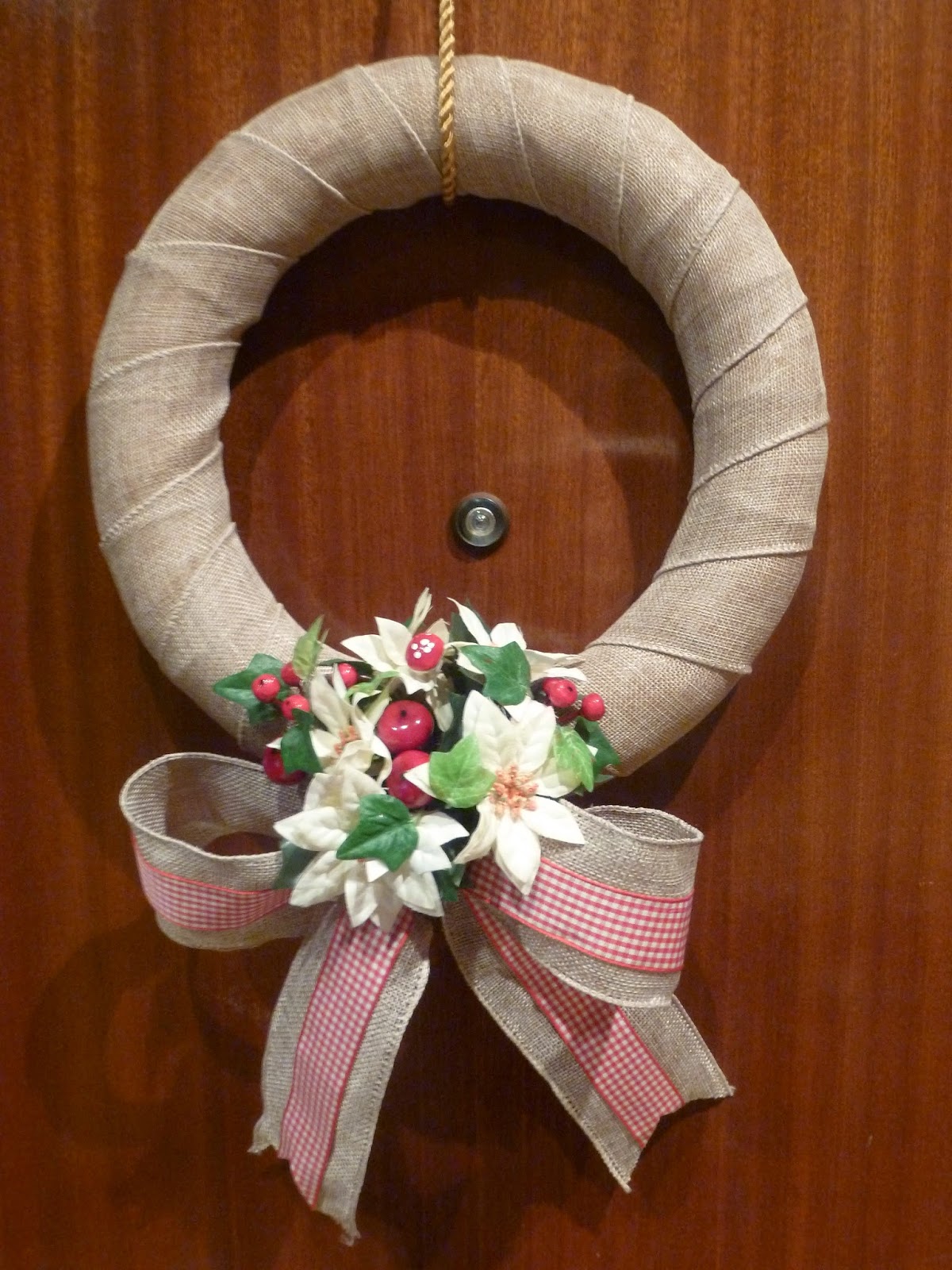He usado una base de corona de polispán que he forrado con lazo de tela de saco. Me gusta el aire rústico que le da, y tiene mucho cuerpo, lo que hace muy fácil trabajar con él.
