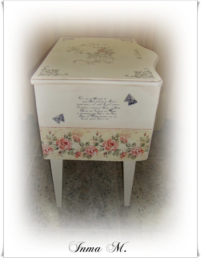 He utilizado unos stencil con stucco, para los laterales y el frente una servilleta de flores en un estylo muy vintage y tambien unos sellos de escritura y una mariposa.