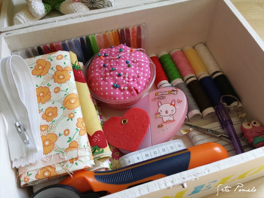 Hay casi de todo: unos fat quarter que me traje del A.C. Moore de Ithaca (NY), hilos de colores, alfiletero digoenero con agujas y alfileres, una cremallera blanca, elástico, tijeras, un boli kawaii, una cinta métrica, un cortador circular y una cajita rosa con los ojitos de seguridad de los amigurumis. El corazón de fieltro siempre me recuerda que todas las creaciones que salgan de ahí estarán cargadas de amor y cariño.