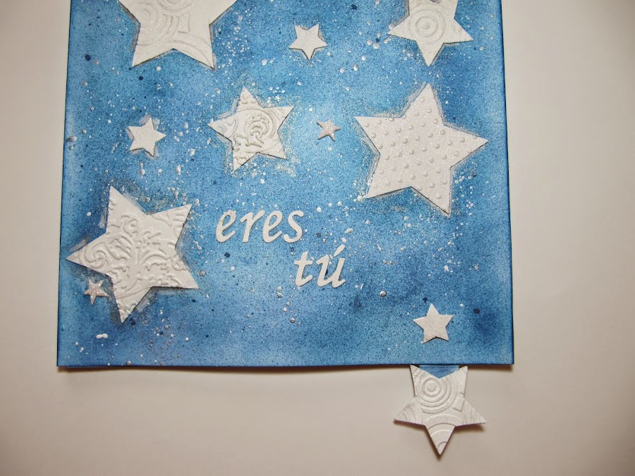 He utilizado distintas tintas de color azul, de distintas efectos de textura, quería que fuese irregular, salpicando gesso y pintura de color plata, he rociado Glimmer Mist, igualmente de distintos tonos, esto a la vez de usar Wink of Stella en cada una de las estrellas y de las letras le ha dado un brillo muy especial!!