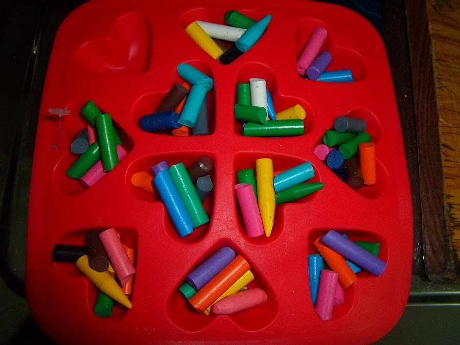 El resultado? unos bellos corazones de crayons mexclados con el plástico del molde, jaja...., todo a la basura. Lo que falló fué el molde que debía no ser apto para el horno, ains estos chinos!!