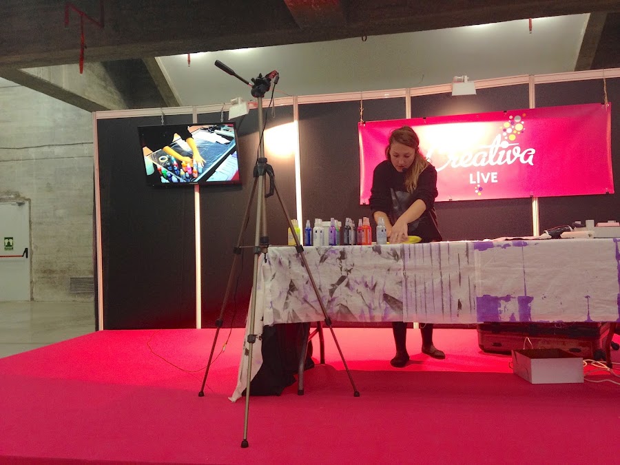Asistimos a un par de eventos en el escenario de creativa Live. Me encantó una demostración de pintura en spray. Nos enseñaron a crear estampados doblando las telas de diferente manera.