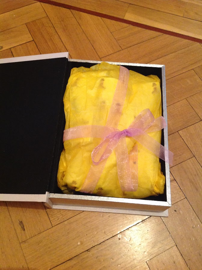 Una bolsa que contenía esta caja. De la bolsa colgaba una etiqueta de Laraqüe, que es la marca de dos amigas a las que adoro y que hacen unos tocados de la muerte. Como ya te imaginas son Raquel y Eva.