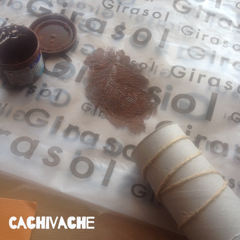 Con un tubo de cartón de papel higiénico preparé mi sello, atándole una cuerda alrededor del tubo. Apliqué tempera en un plástico y lo pasé por encima hasta que la cuerda se empapara del color chocolate.