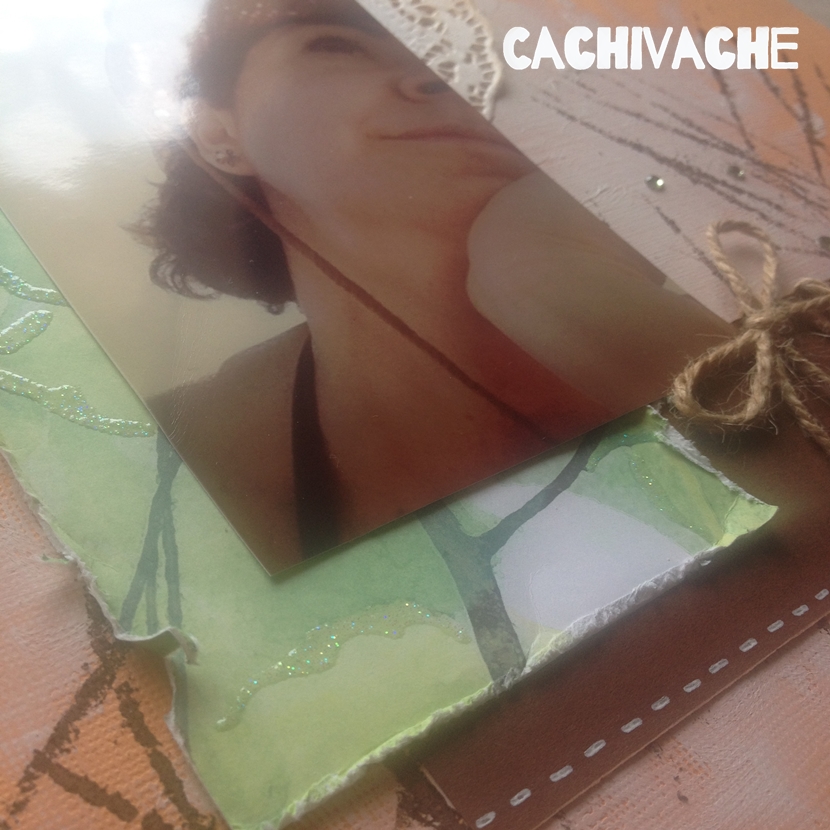 Un rectángulo de papel decorado y desgastado en los bordes con el filo de las tijeras, una blonda y la fotografía superpuesta.