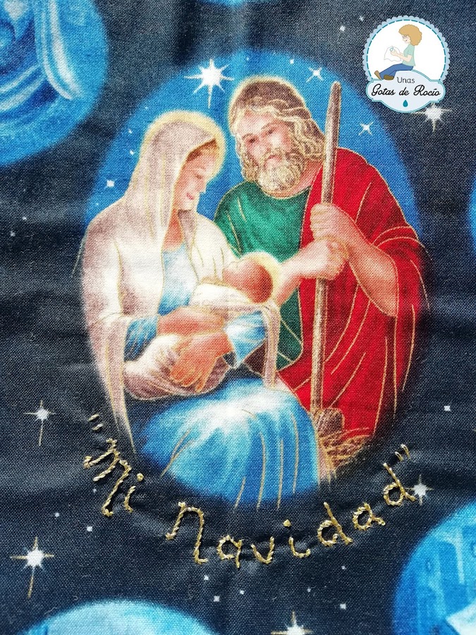 Encontré esta tela de estampado navideño tradicional en Gloria Patchwork, a la que añadí un texto bordado con hilo dorado ("Mi Navidad").