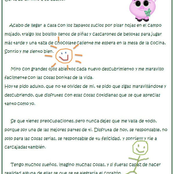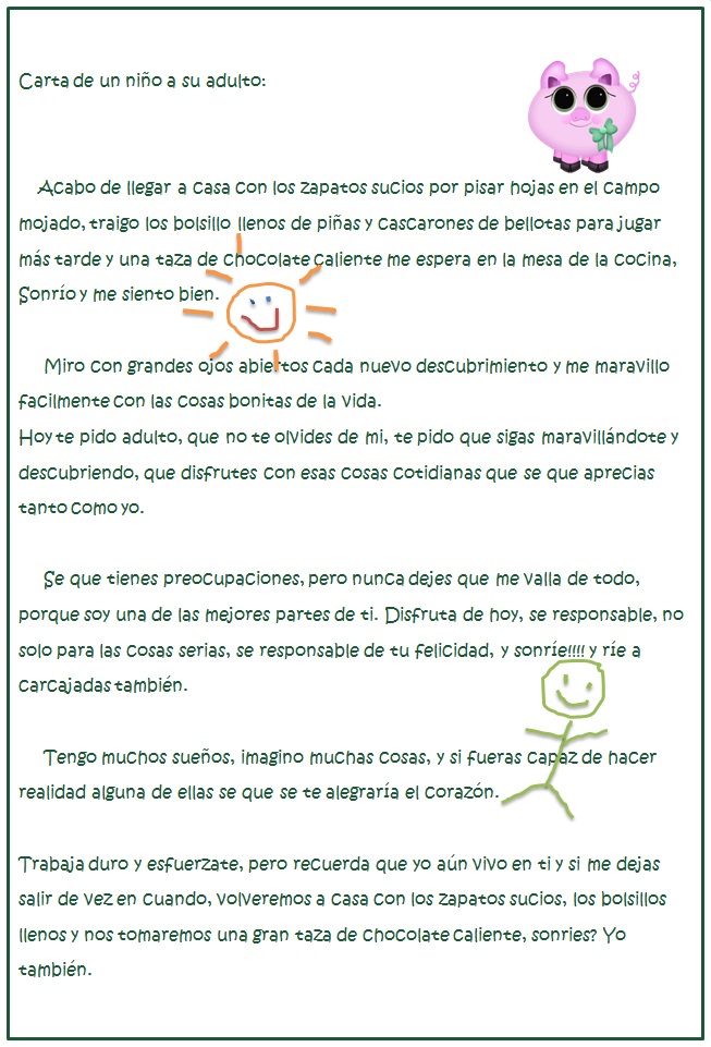 Nos volvemos serios, hay muchas responsabilidades, facturas, trabajo y nos olvidamos de esa pequeña parte de nosotros, nuestro niño interior, ese que nos enseña que aun podemos jugar, sonreír e imaginar, y en vez de ser de colores, somos grises y apagados, por eso hoy, os voy a dejar la carta de un niño a su yo adulto, una carta que es la que yo imagino que una niña pequeña me escribe desde muy lejos, pero también desde muy cerca.