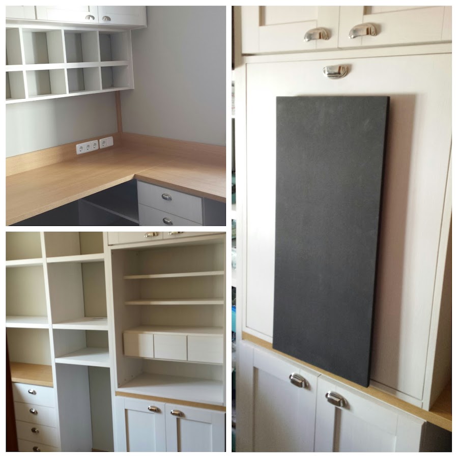 La habitación consta: de una zona de trabajo amplia con estanterías en cuadrícula para poder tener a mano las cosas que utilizo más, una zona de ordenador, otra zona donde guardar el carrito del "guarreo" y todo el material de pinturas, lienzos..., un pequeño rincón para la máquina de coser y una mesa abatible para poder abrir cuando necesite más espacio. Además de armarios y cajones para tener recogido y guardado todo el material que tengo de Scrap y otras manualidades...