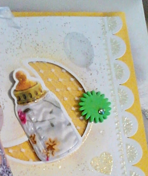 En el centro una luna con un biberon de cartulina y tela. Flor de goma eva en verde con brillantito. En relieve corazón y medias flores.