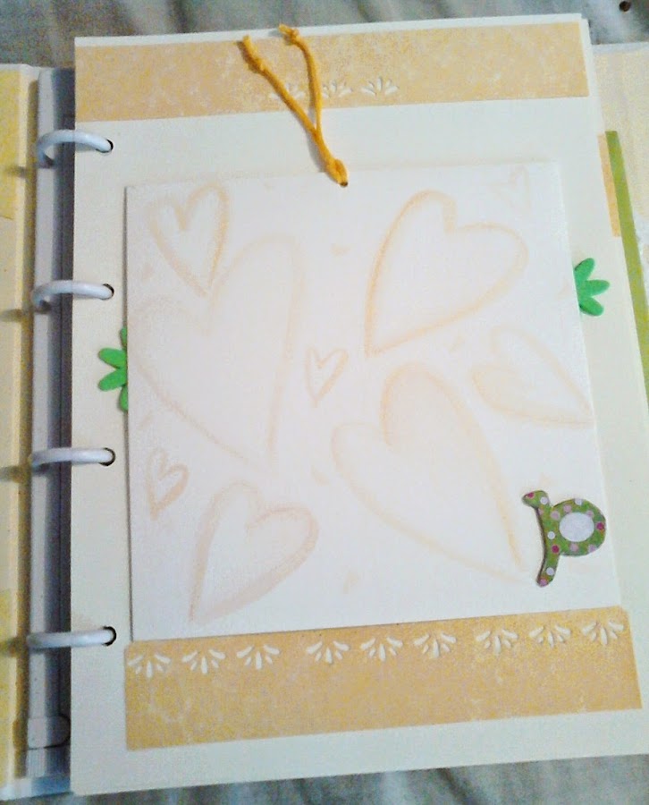 La siguiente pagina lleva un desplegable con tema de corazones, combinado en los mismos tonos amarillo y crema. Cenefa hecha con troquelador en el mismo papel tramado amarillo y crema. Flores de goma eva verde y letra del nombre imitando madera, hecha a mano con relieve.
