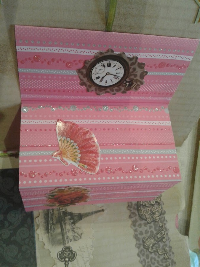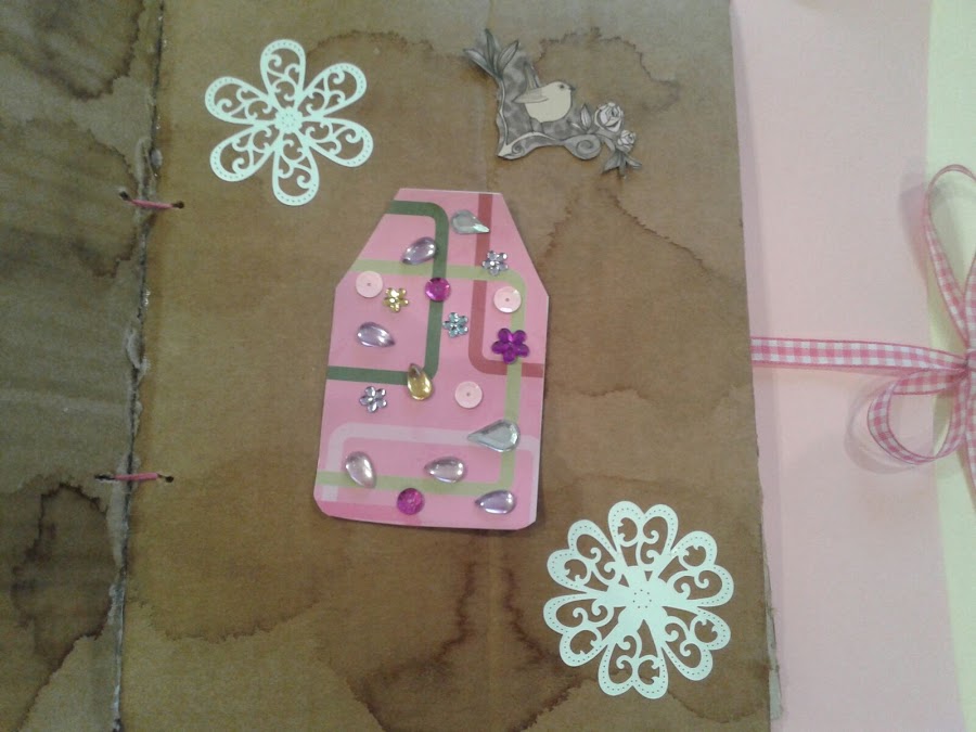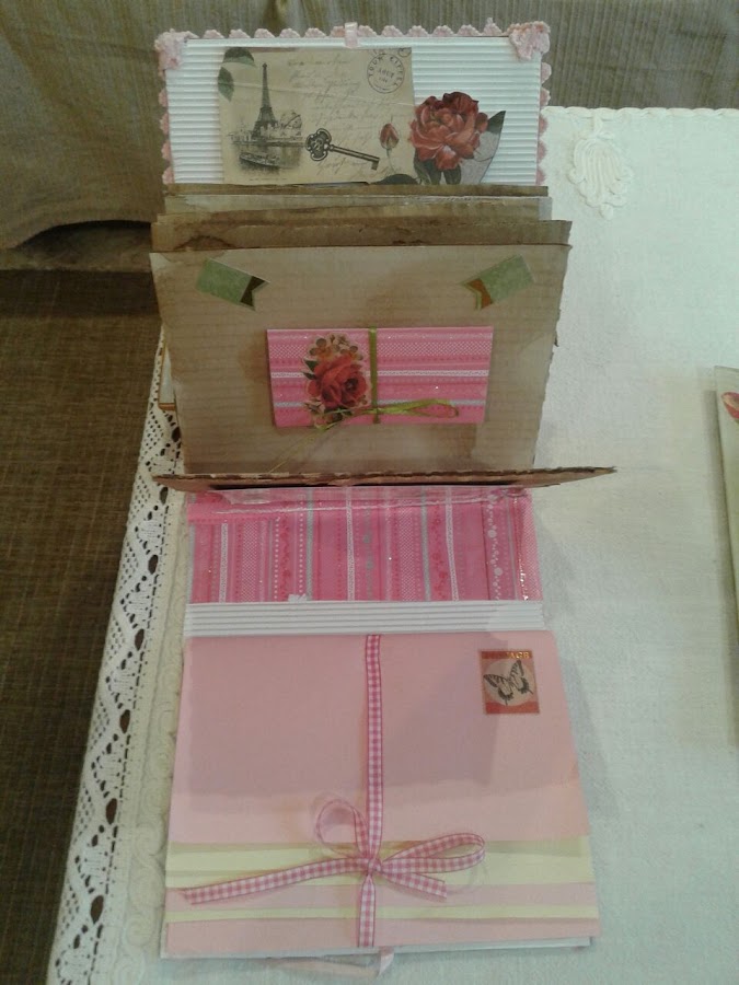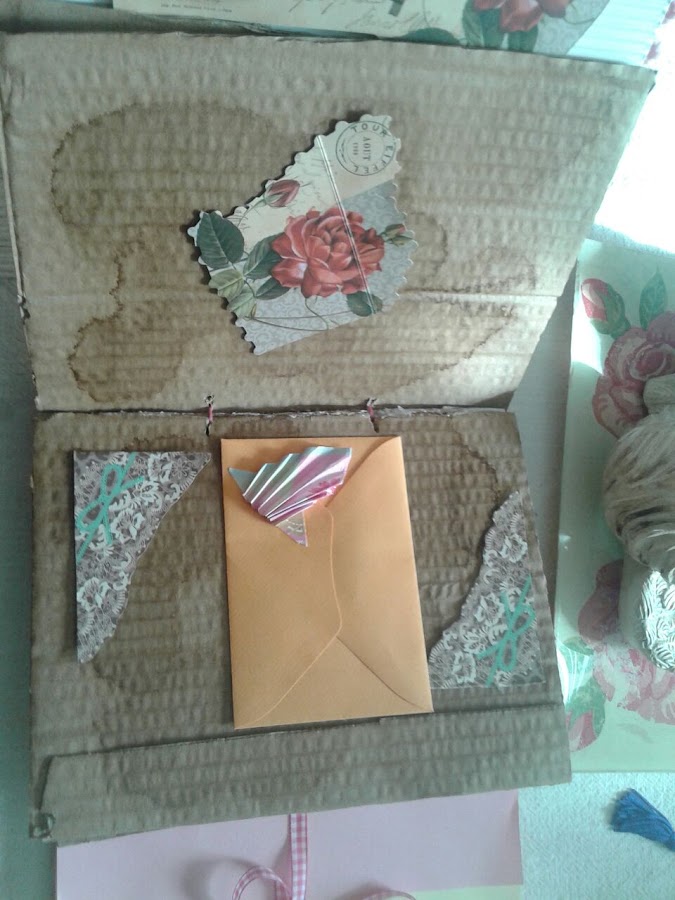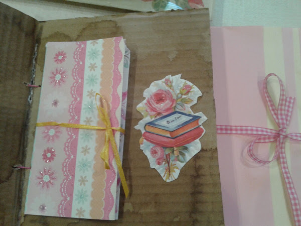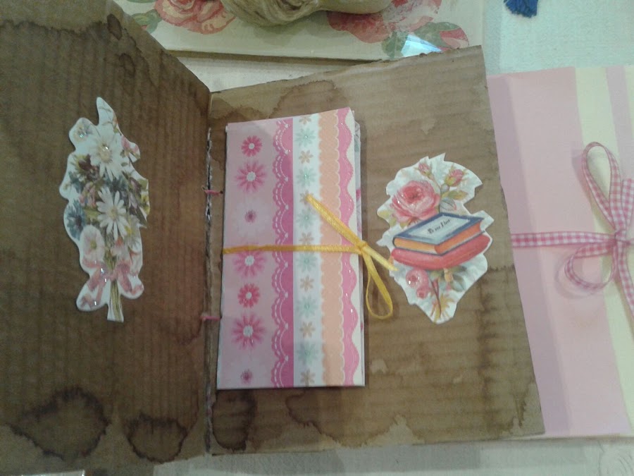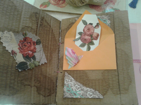 En esta parte lleva como una especie de sobre, con hojas de dos colores, cerrada con una cinta y sirve para guardar fotos.