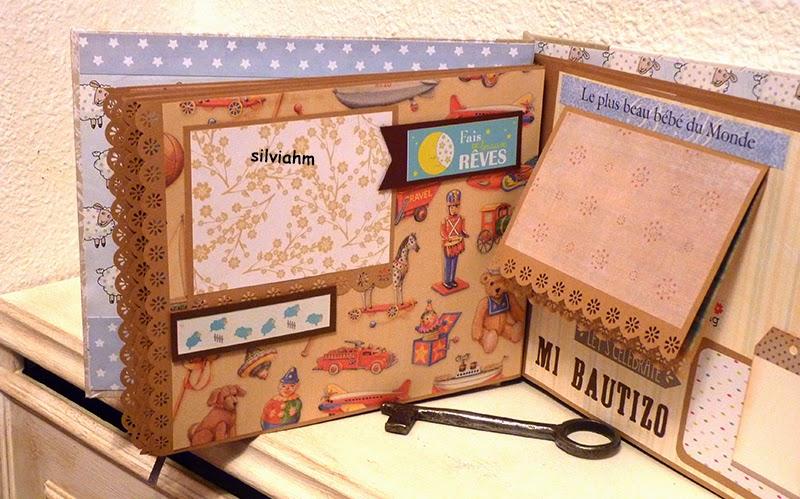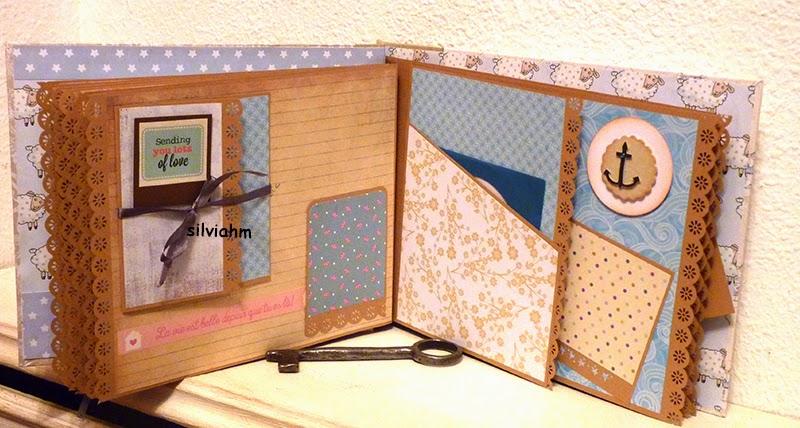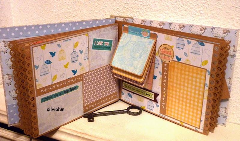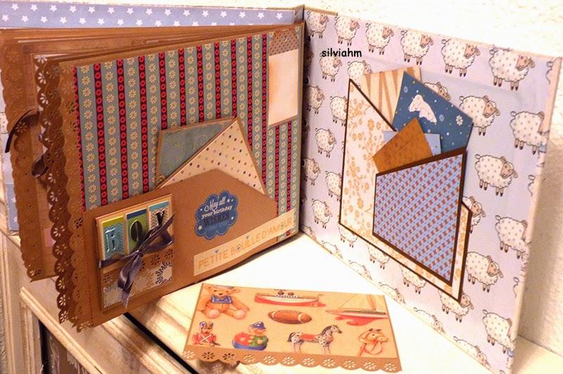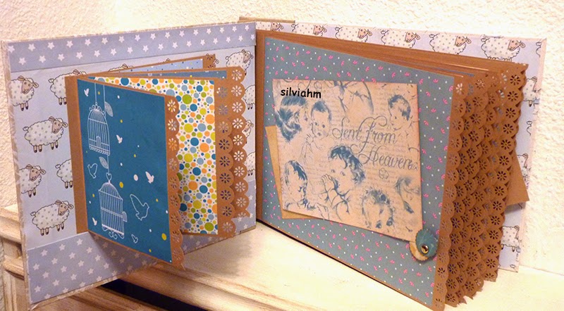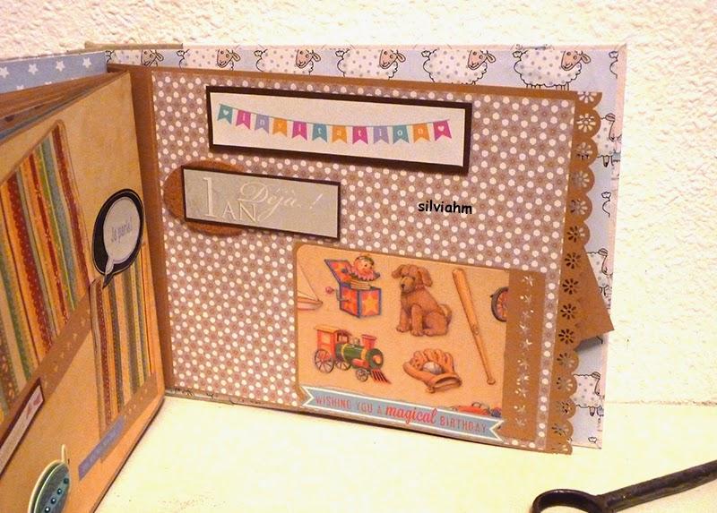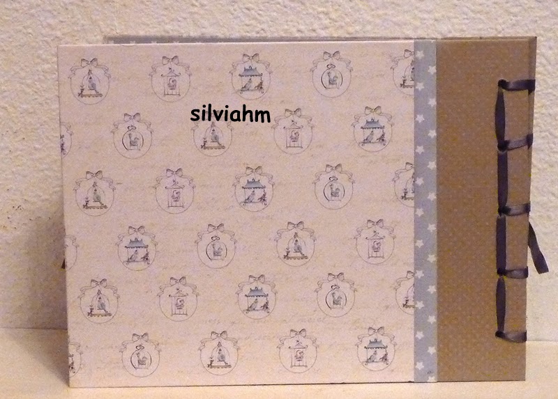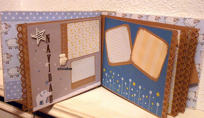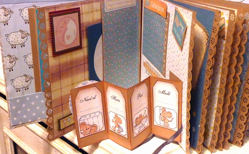 Este álbum sale hoy para Barcelona. Es otro de los encargos navideños. Es un álbum con encuadernación japonesa, 11 hojas tamaño folio, con mucho desplegable, tarjetas en cascada, tags muy personalizados. La colaboración con la mamá ha sido mucha, hemos estado en contacto comentando ideas, viendo papeles, detalles a añadir.. Creo que los proyectos de scrapbooking son muy personales, por lo que me gusta ceñirme lo más posible a la idea que tiene quien lo encarga. Así, pensamos en hojas para cuando ella estaba embarazada, con espacio para eco en 4D, otra con datos del nacimiento, navidad, carnavales, el bautizo, un dia en la playa, primeros pasos, primera papilla, fotos con papá y mamá y , en la última, su primer cumpleaños. Tiene cabida para 71 fotos de distintos tamaños, casi todas para fotos de 10x15 y otras más pequeñas en los desplegables.