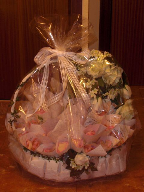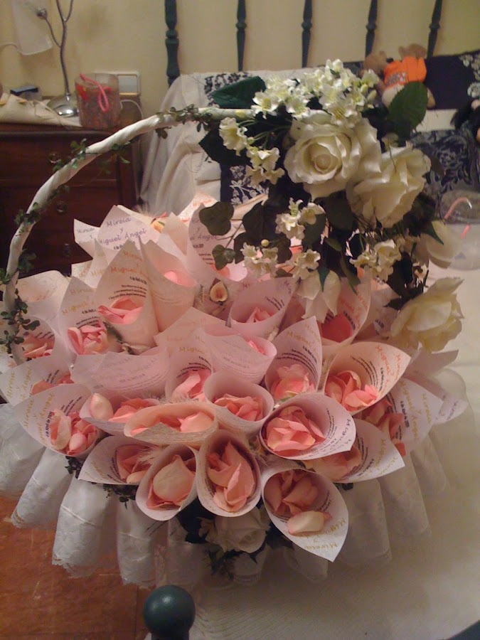 El trabajo consistía en cambiar el típico arroz que tanto mancha el traje de los novios por pétalos de rosas, pero en este caso pétalos de rosas deshidratas para que si llovía (estuvo toda la semana antes lloviendo) o si se pisaban (que sería lo más normal) tampoco manchasen. No sé puede apreciar en las fotos pero cada capuricho llevaba inscrito por la parte interna el nombre de los novios, la fecha y una pequeña poesía. En la parte de afuera, llevaba un ramillete de una cala en color crema (hecha de algo similar a la arcilla) a juego con el ramo de la novia. Todo muy conjuntado.