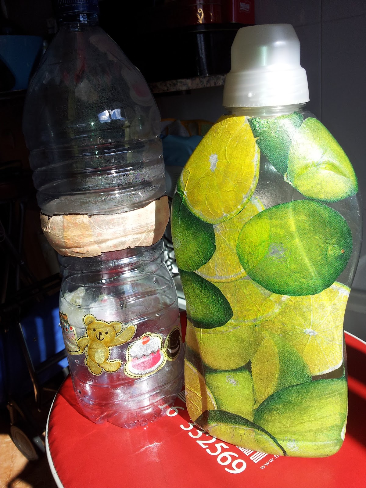 Como tenía las dos botellas, la de agua y la del suavizante, le pedí a mi niño que participara en la manualidad. El resultado es el de la foto. La de motivos infantiles la hizo él (con un poquito de ayuda a la hora de recortar), y la otra yo. No ha quedado muy bien que digamos, pero satisfecha con el objetivo, que no era otro que "Iniciarme y Divertirme".