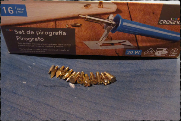 El pirografo de marca Crelando, lo adquirí en el Lidl, como he dicho es un pirografo sencillo, no tiene regulador de temperatura ni interruptor, trae 14 puntas diferentes y una placa para apoyarlo; es poner la punta, enchufar y esperar 5 minutos a que caliente.