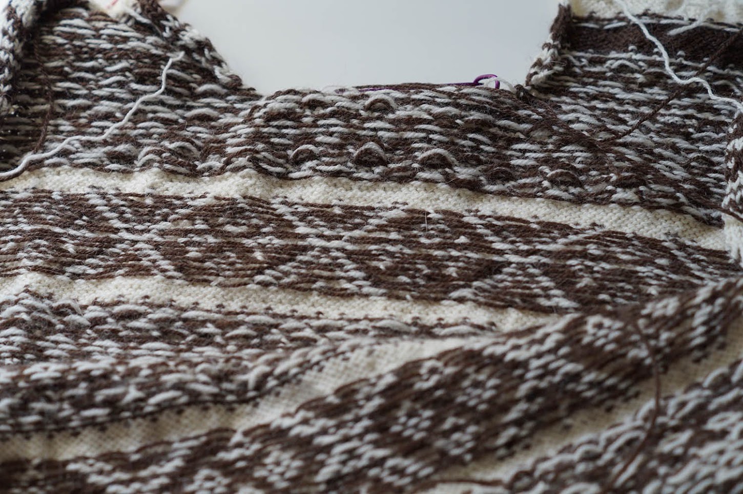 He tejido el jersey en circular hasta las sisas y el jacquar a dos manos, una para cada hilo (estilo inglés y continental a la vez). No tengo ni idea de si se hace así pero me ha resultado muy rápido. Para cerrar hombros y sisas he utilizado el kitchener stitch, que me gusta mucho porque no se nota nada la costura.