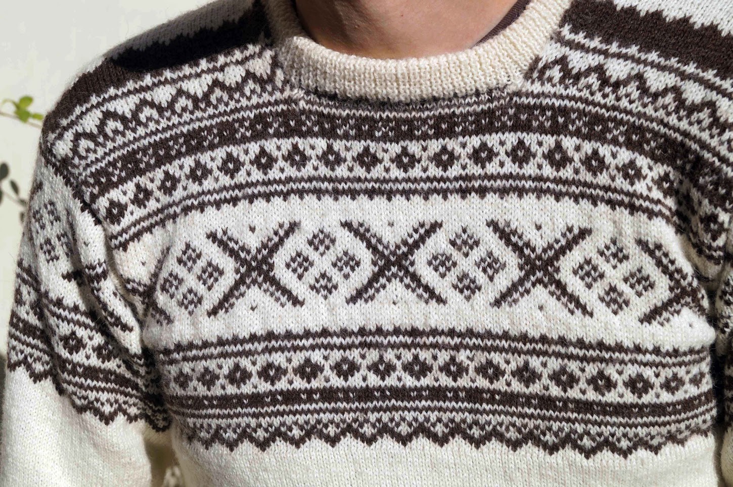 Mi experiencia con el jacquard era muy limitada así que me ha servido para practicar. He cogido soltura y he conseguido una buena tensión del hilo. En esta técnica esto es muy importante para que el hilo no quede suelto ni tenso y la labor tenga la elasticidad adecuada. Además, he usado hilos diferentes porque quería gastar lanas que ya tenía, así que ni el grosor ni la elasticidad son los mismos y eso se nota en el resultado, otro obstáculo que salvar. El blanco hueso es Drops Flora color 01 y el marrón Abuelita Merino Three Ply color 6845.