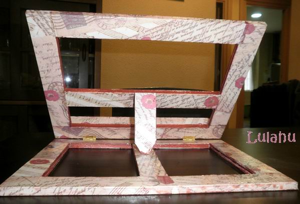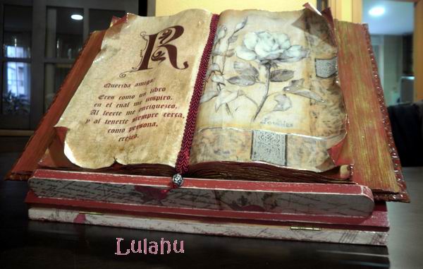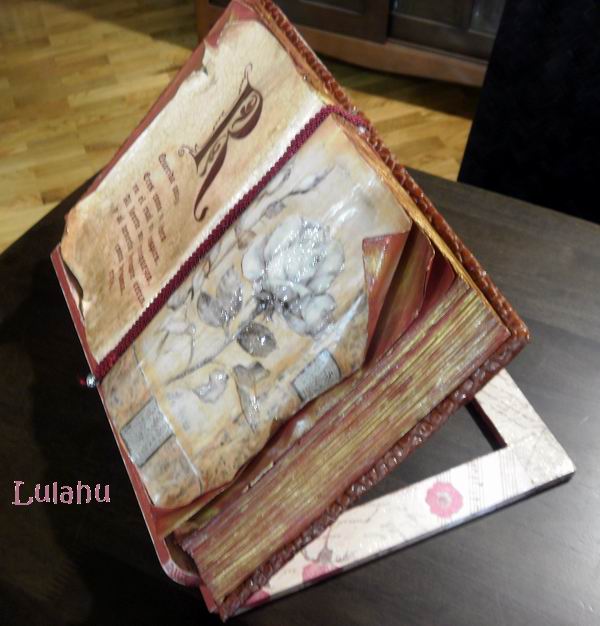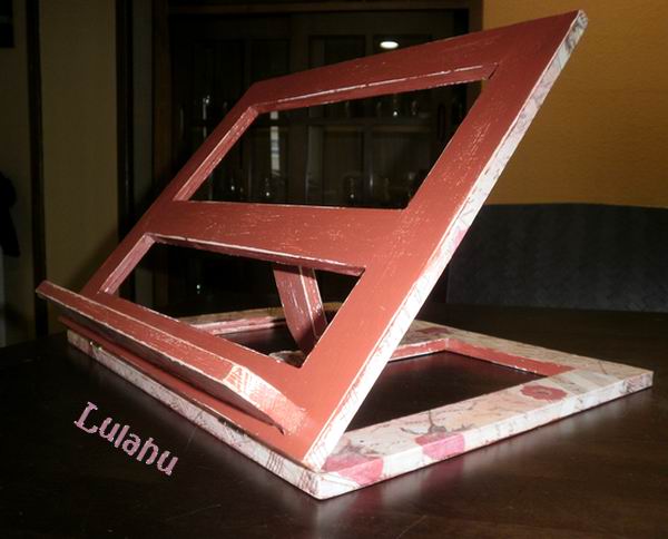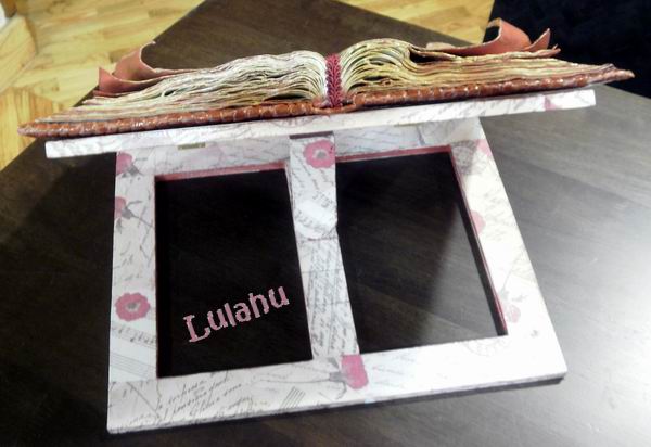 Buenas noches, cómo va todo? Recordáis este libro que le hice y regalé a mi amiga María cuando se casó su hijo? Pues siempre me estaba diciendo que se tenía que comprar un atril, porque se le escurría en la estantería que lo tenía y no quería que se le estropease. Le dije que lo dejara en mis manos, y así empecé. Compré un atril de no muy buena calidad en un bazar chino, lo teñí con tinte color av ...