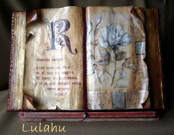 Un regalo original para un niño de comunión, ¿no os parece? Este es el libro envejecido que hice para mi sobrina. A ella le gustó mucho, ya que también es aficionada a las manualidades. Os dejo unas fotos del libro entero y de otros detalles, como el forrado de las pastas imitando el cuero envejecido. También las esquinas de las páginas enrolladas como las hojas antiguas de libros y pergaminos.