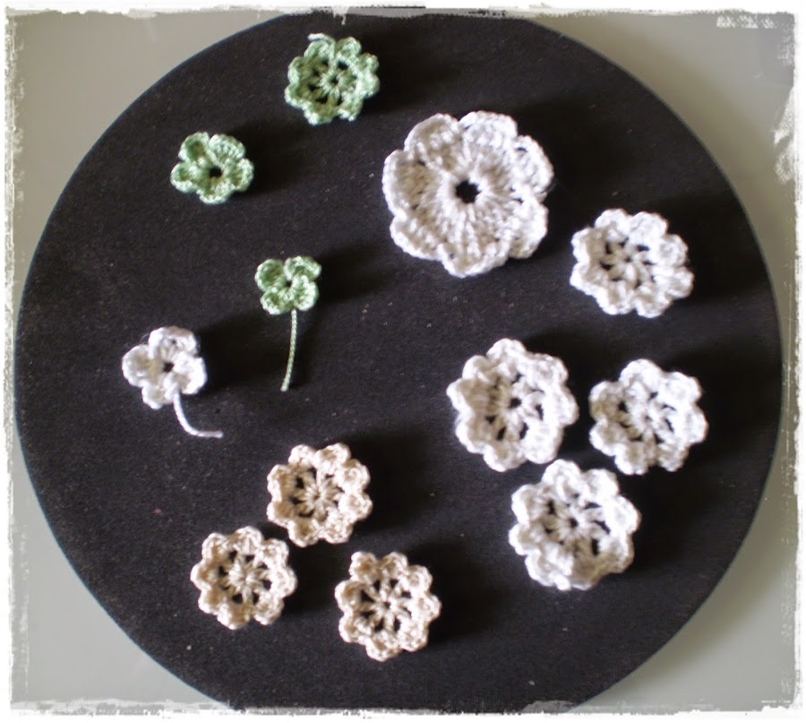 Las puntadas para cerrar los frunces, no me quedaron muy bien, así que puesto a aprender, me dije..voy hacer unos adornos de crochet para ponerlos y ahí están.