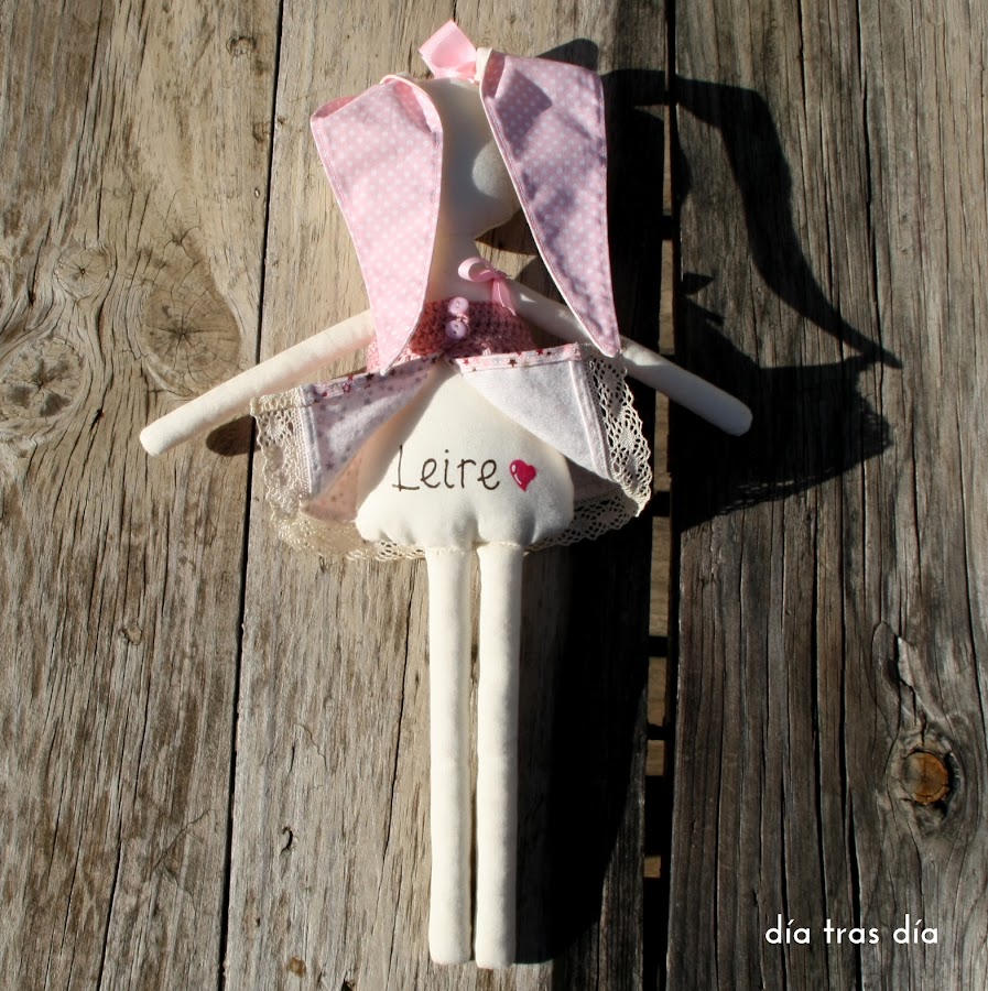 Hace ya varios meses me escribió Esther, hermana de mi amiga Mónica (de la que ya os he hablado en varias ocasiones porque suele confiar muchas veces en mi trabajo para regalar detalles personalizados) y me planteó una idea-reto para ver si yo sería capaz de hacerlo. Esther, que había sido mamáhacía muy poquito cuando se puso en contacto conmigo, me dijo que le gustaría que le hiciera para su peque Leireun conejito de trapo con grandes orejotas que se convirtiera en ese muñeco del que los niños no quieren desprenderse en ningún momento.