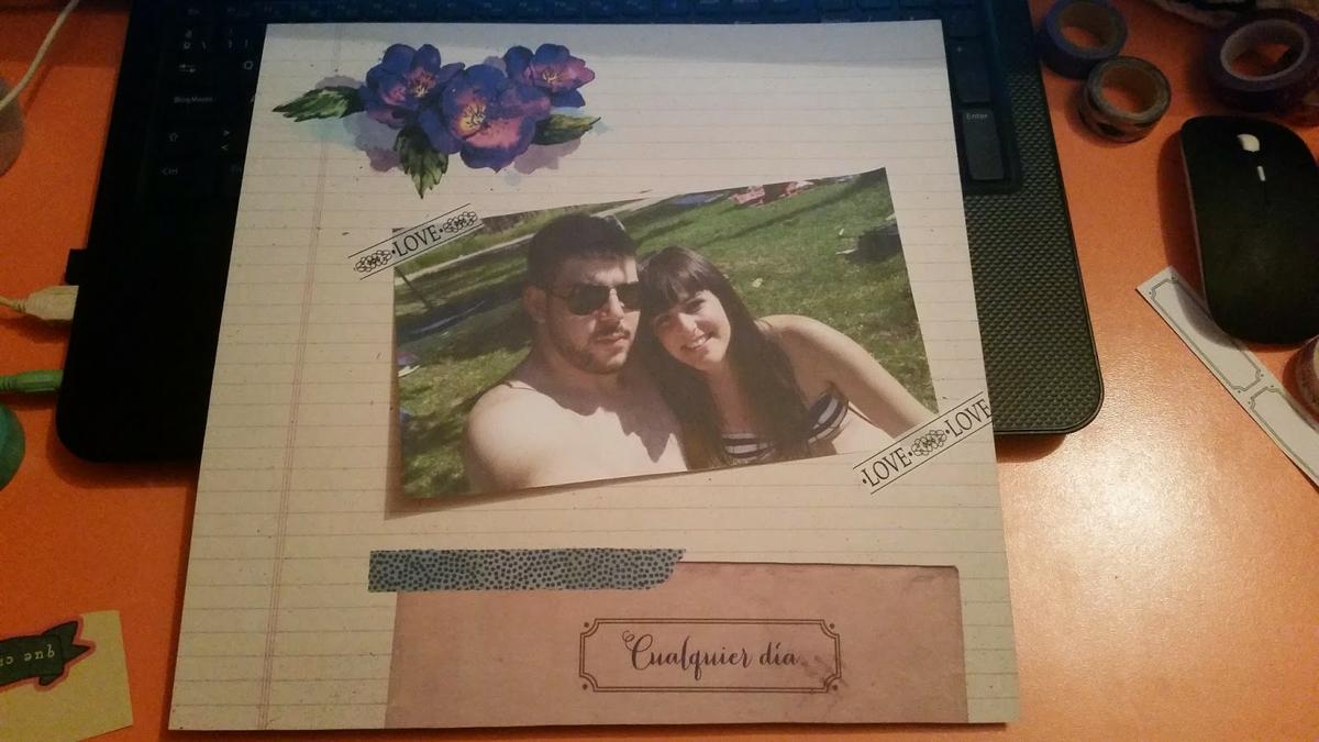 El proceso es bastante sencillo. Tras elegir uno de los papeles (creo que esto fue lo más complicado, por eso de ser por ambas caras y ya quedarte sin una de ellas), coloqué la fotografía de la forma que más me gustó y la sujeté con un washitape con la palabra LOVE. Esto lo hice así y no con cinta de doble cara, porque quiero cambiar la foto en un futuro por la misma pero en mejor calidad.