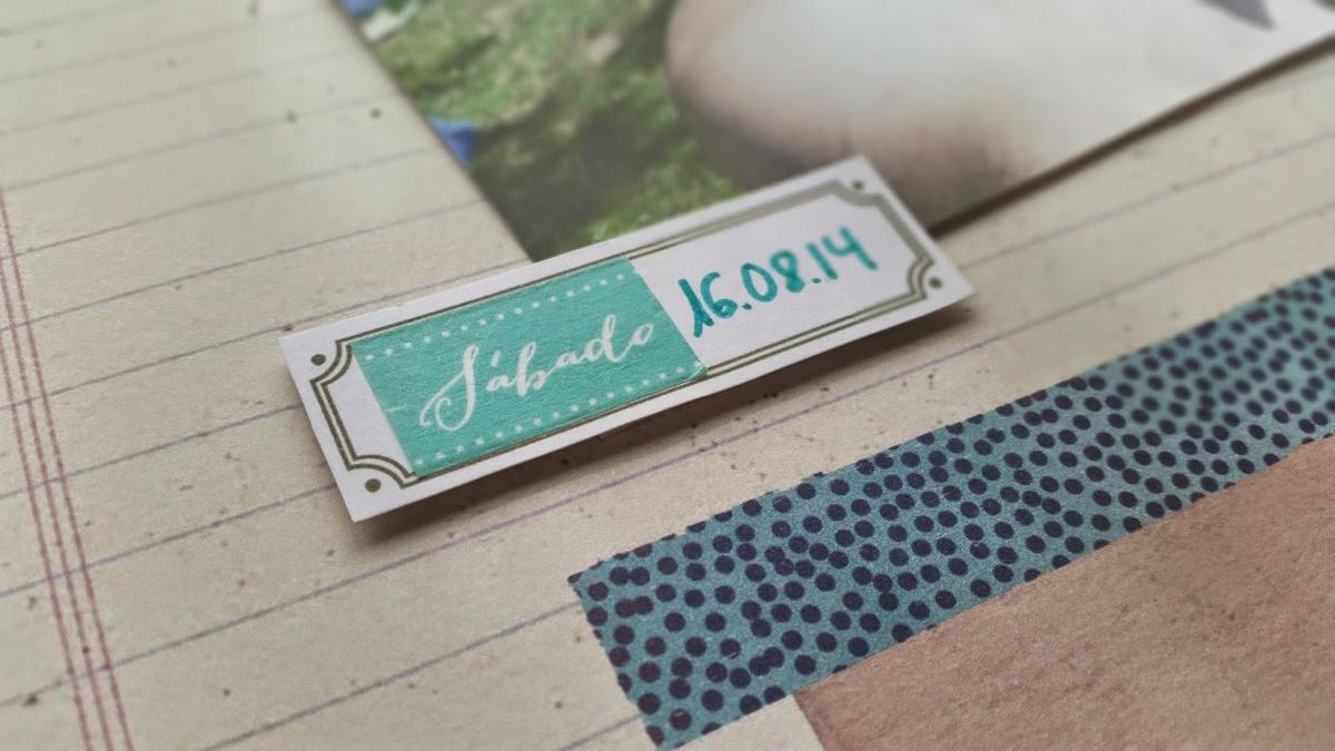 Lo último que puse fue uno de los cartelitos que había recortado previamente del papel y que formaba parte de uno de los bordes, le puse un trozo de washitape con la palabra "Sábado" y escribí con rotulador del mismo color la fecha. Así queda constancia del día en el que se hizo la foto.