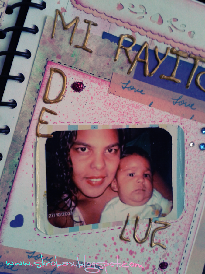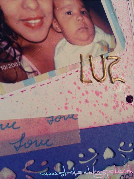 Aquí el requisito era que llevara washi tape o deco tape y bueno como todavía no he tenido ninguno en mis manos, me fabrique este, simplemente tome la cinta de carrocero o cinta de papel y la pinte con un poco de pintura acrílica rosa y después que se seco le escribí la palabra love con un lapicero azul super hermoso las letras están hechas con bordado liquido de color oro y bueno tenia que empezar a colocar mis fotos con mi hija zoe cuando era bebe y así puedo guardar a través del tiempo este momento. y es que de eso se trata el scrapbooking es un libro de recuerdos.