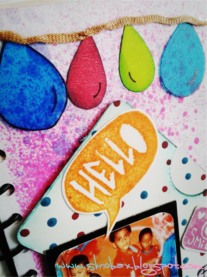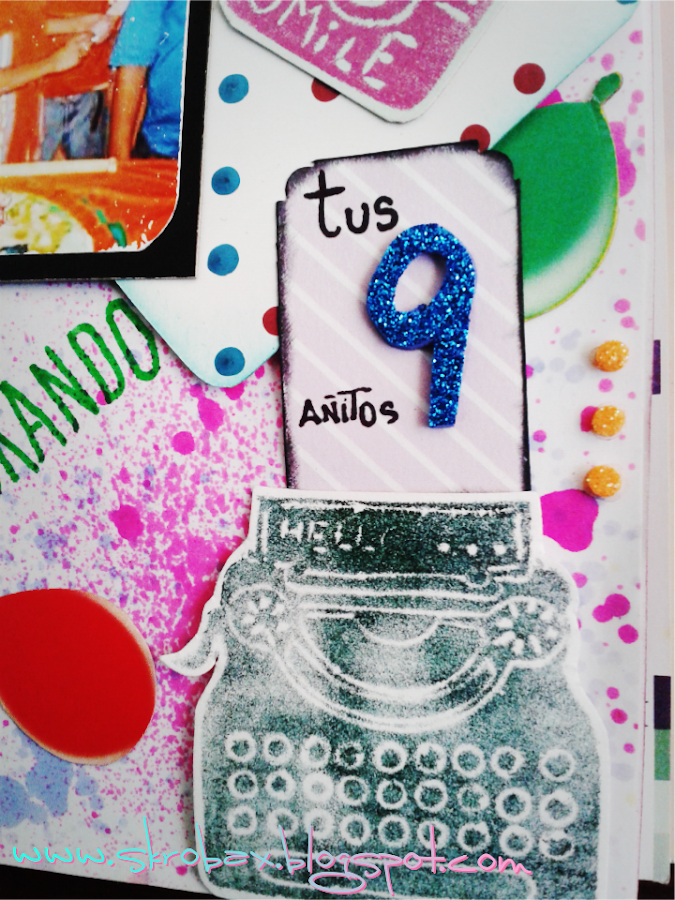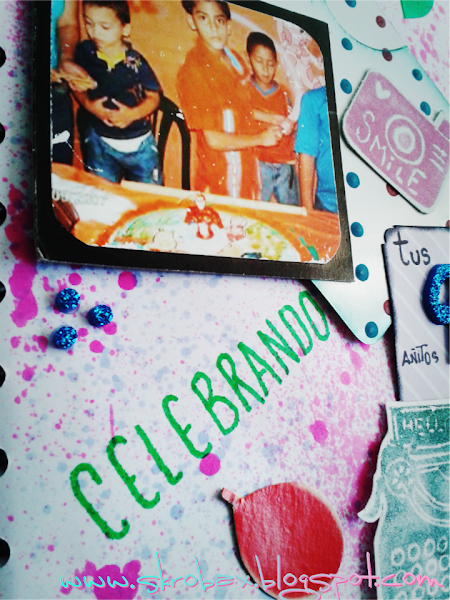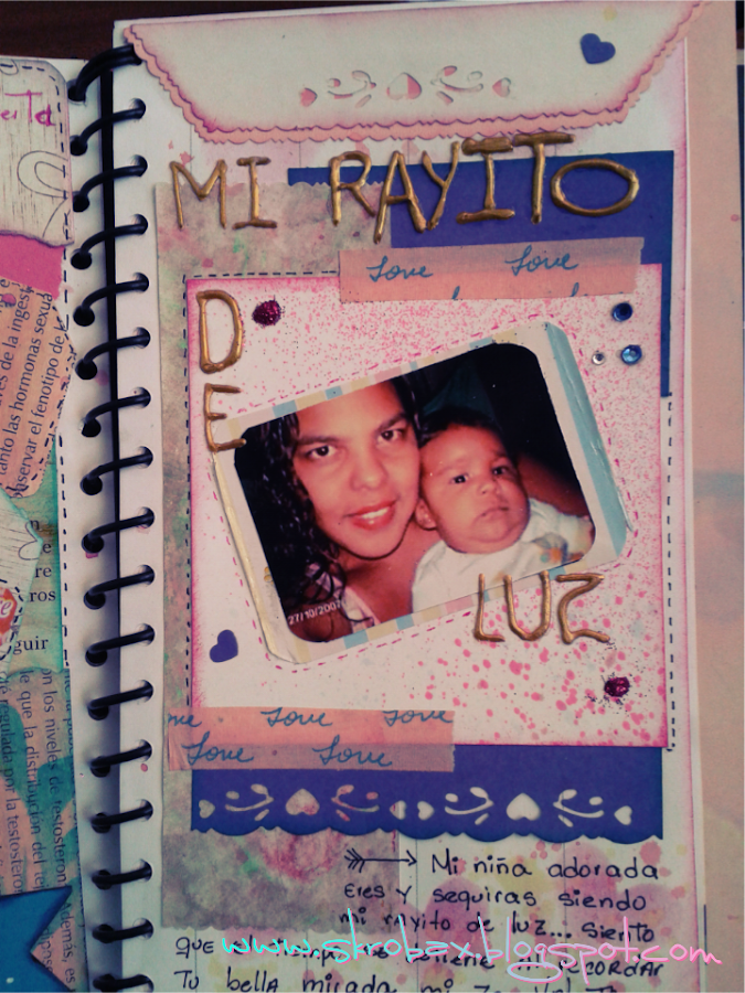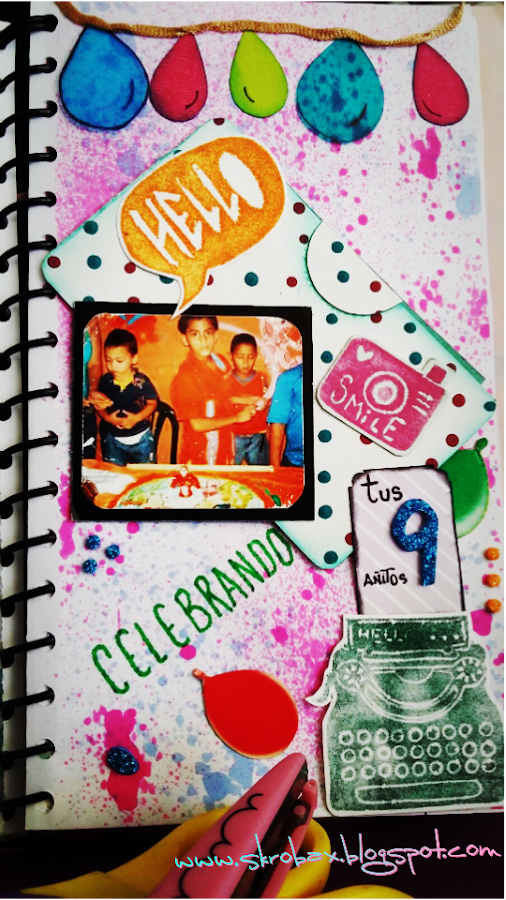 En esta pagina tenia que llevar una foto o un recorte de revista y como ese día estaba como happy decidí preservar la foto de mi hijo mayor en su cumpleaños numero 9. wuauuuuuuuuuu ya tiene 17 jajajaja pero sigue igual de bello mi muchachito, los globitos los recorte de una carpeta de acetato de colores y utilice algunos sellitos caseros, la pagina de fondo esta salpicada con tintas al alcohol y a que no adivinan???? también caseras. jajajajajaja.... Es que no se pueden imaginar la cantidad de cosas que podemos hacer cuando no disponemos de los materiales.