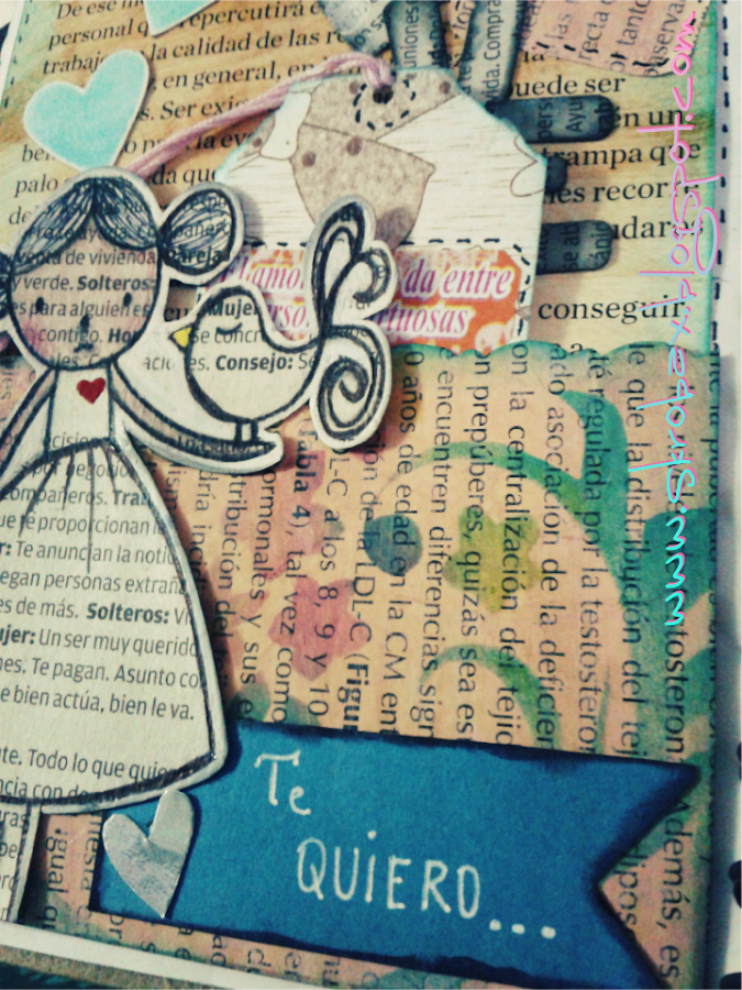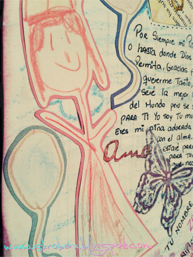Mi hija Zoe es una artista y se la pasa haciendo dibujos y regalandomelos así que todos los guardo y en esta pagina utilice como fondo uno de sus dibujos y la muñequita es de una tarjeta que me regalo el día de las madres y esa supuestamente soy yo.... me encanta que me vea sonriente y con corona y eso me pone el corazón arrugadito. a poco no quede hermosa? y el requisito de esta pagina era que llevara sellos, pero como no queria saturar la pagina para así poder apreciar su arte, solamente coloque 3 sellos; uno de mariposa la palabra te amo y un sellito que hizo ella también de flores que coloque al pie de la pagina