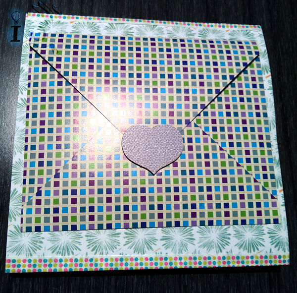 En la parte trasera hay un gran sobre que he llenado con formas de estrellas y mariposas de madera, que quedan muy bonitas en los trabajos, aunque yo ya no tengo claro si estos trabajos entonces son de scrap o de mix media... y cierro el sobre con un corazón de madera para que no se salgan y acaben todos esparcidos por el sobre de correos.