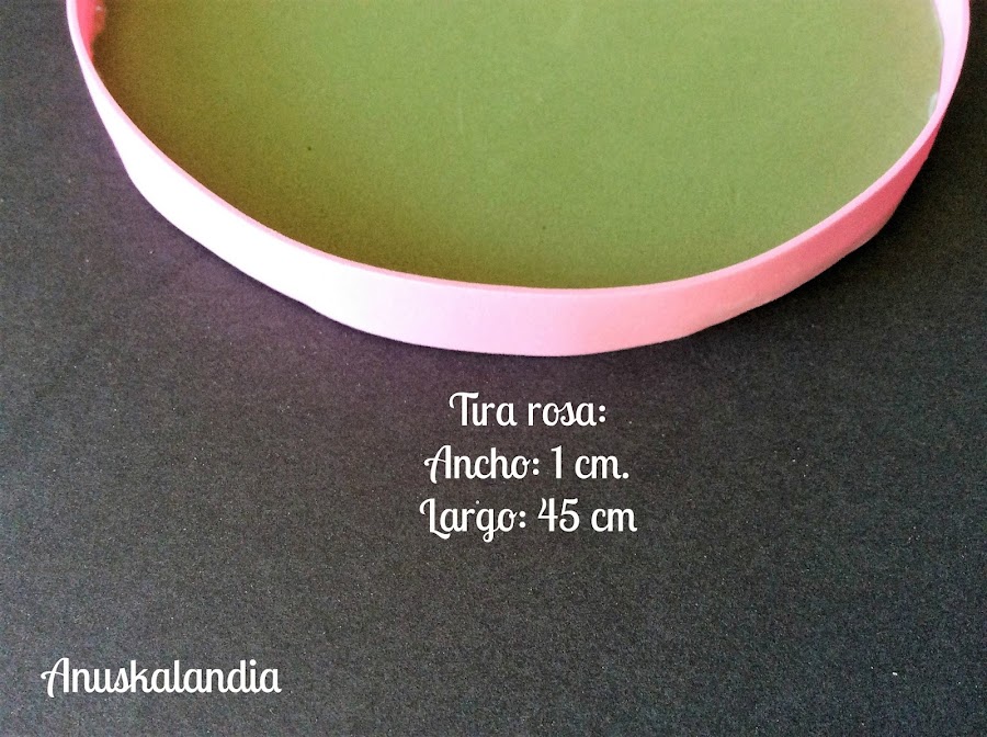 15.- Cortamos una tira de goma eva del color de nuestra elección, con las medidas que aparecen en la foto adjunta.