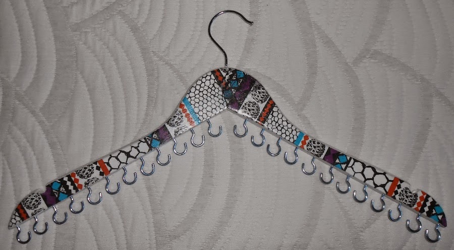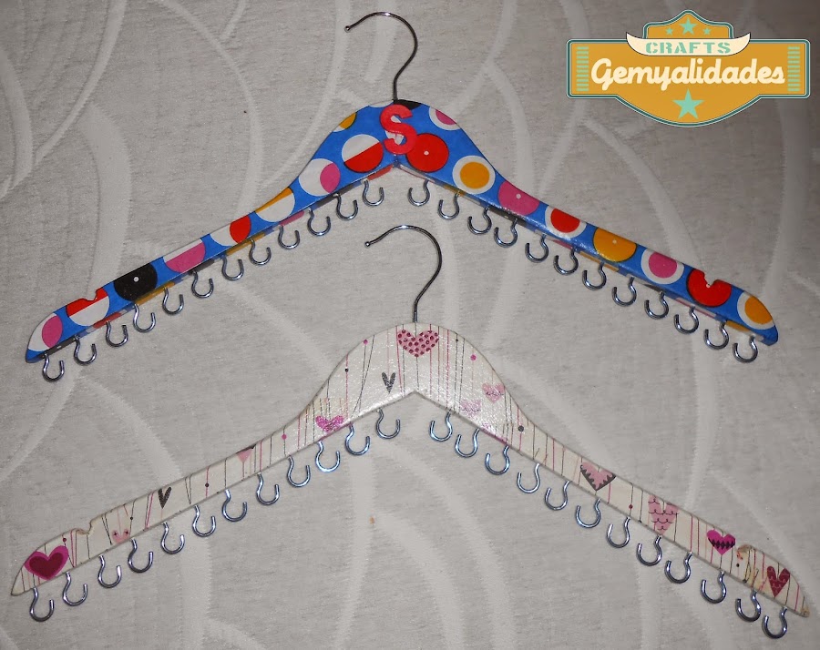 Harta de tener que desenredar veinte collares cada vez que quería ponerme alguno, me puse a buscar algo que me evitara este problema, algo que pudiera hacer en casa, con un bajo coste y que fuera bonito. La idea la ví en varios sitios de internet, pero los resultados no me terminaban de convencer, unos no estaban decorados y me parecían muy sosos y simples, de otros no me gustaba cómo colocaban los ganchos... Así que, partiendo de las diferentes ideas que había visto, me dispuse a hacer el mío de modo que a la vez que los ganchos quedaban puestos de forma fija y segura en la percha y además fuera personalizado, para que además de servir para ordenar los collares, adornara un rinconcito de mi habitación.