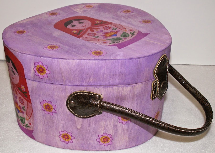 Una vez seca la pintura, he usado servilletas de papel donde aparecía una matriosca. He recortado la matriosca y he jugado con las posibilidades de colocarla en diversas partes de la sombrerera, pero al final lo que mas me ha gustado ha sido colocar una central en la tapa y varias alrededor, de modo que queda dividida en dos al abrir la caja. Y con otras servilletas de florecitas, he recortado varias, colocándolas dispersas por la sombrerera.