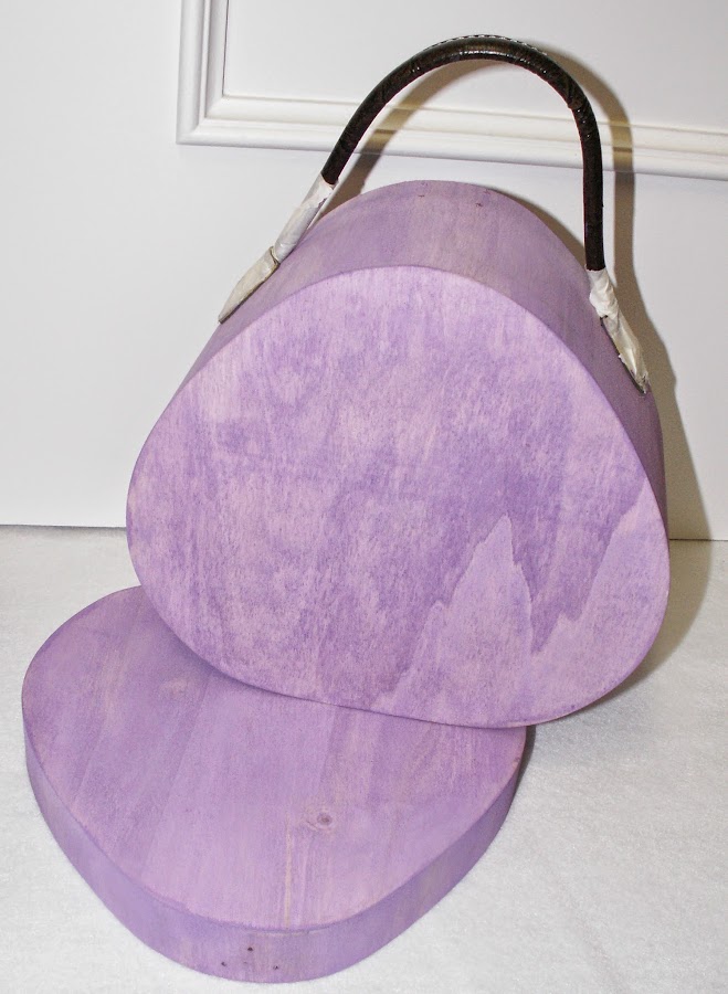 Para mantener el tono claro no he pintado la sombrerera, la he teñido. He usado pintura acrílica diluida en agua para hacer el tinte. He ido diluyendo la pintura y probando en un trozo de madera que tenía hasta encontrar el tono que más me ha gustado y este ha sido el resultado de las pruebas. Se sigue viendo la veta de la madera, pero esta teñida de color morado.