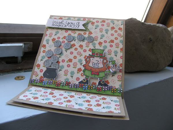 Esta es la mía, una postal tipo caballete, cerrada queda cuadrada y abierta se apoya sobre si misma quedando tal y como se ve. Al preparar el material no tuve en cuanta un par de cosas, como el sentido del papel de la base, es lo que pasa cuando no sabes exactamente lo que vas a hacer. En las decoraciones tenia preparados estos sellos coloreados de Paper Smooches que son muy divertidos, están coloreados con rotuladores Noir y Copic.