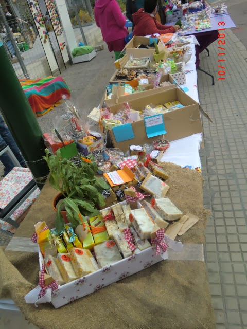 Al final, no sé si seían las 10 y media o las 11 ya, he ido exponiendo los jabones, algunos ni han salido de las cajas, pero tenía miedo que se fuera todo al suelo y así parecía que daba más peso a la mesa; gracias también a esa farola me he podido relajar pq el viento no me gusta nada de nada y lo paso fatal.