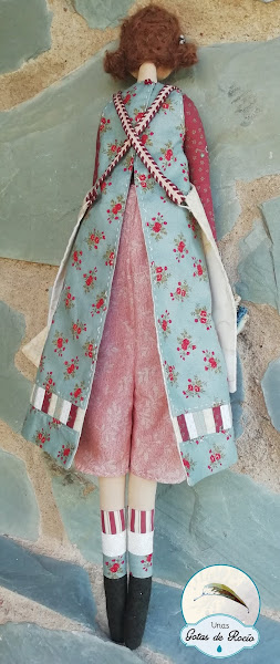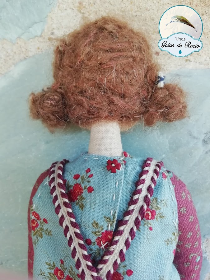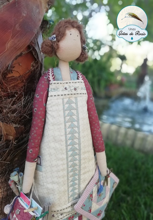 Aunque todas las que asistimos a este monográfico hacemos la misma muñeca, Esperanza nos da a elegir entre dos gamas cromáticas y además, los detalles los disponemos a nuestra elección. Es por ello que yo no le he puesto las tijeras como colgante del cuello, tal como las muñecas originales expuestas en la tienda, sino como tijeras de mano.