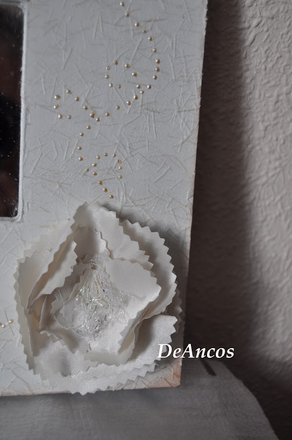 Aparte de la transferencia que hacía para probar por primera vez, decoré el malma con papel de arroz sobre la que pegué una flor que me regaló Ana y de la que salen unos arabescos hechos con liquid pearl.