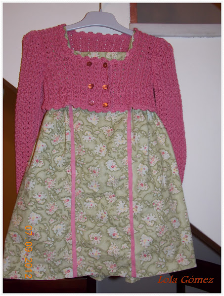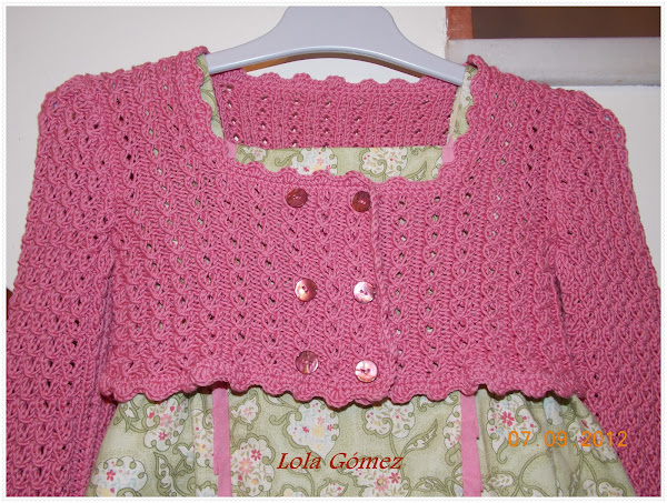 Esta entrada era obligado empezarla con esta foto, pues la veo guapísima, con una cara tan radiante, ay madre que ya ni el babero que me pongo me recoge las babas. La pasada primavera en Kubaloo compré esta tela con hilo Natura DMC para combinar la rebeca. El resultado nos ha encantado a ambas.