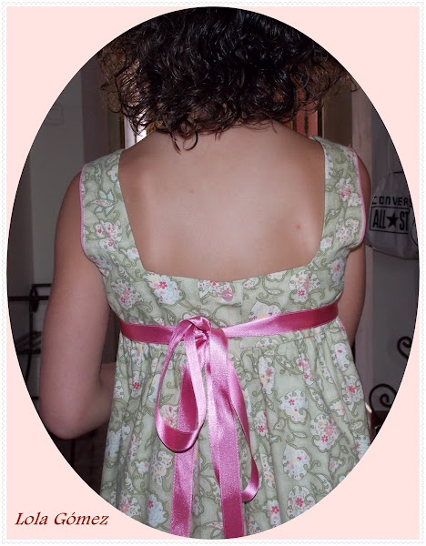 En la espalda mi niña quería un escote grande, "Mami que se vea mucha espalda" ( ay cuando crezca lo que me queda). Le hice su escote cuadrado pero bien grande. Y su lazo rosa que le da un toque infantil que me resisto a perder.