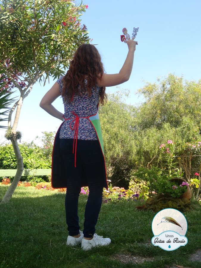 Otro detalle que considero importante es el bolsillo que lleva incorporado el delantal, útil para guardar además de todas las piezas que he preparado, algún instrumento musical que haga de acompañamiento o el libro del cuento en sí, que sirva para cerrar la actividad y contribuya de este modo a asociar lectura con libro y no sólo lectura con narración oral o teatro.