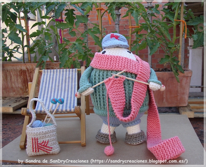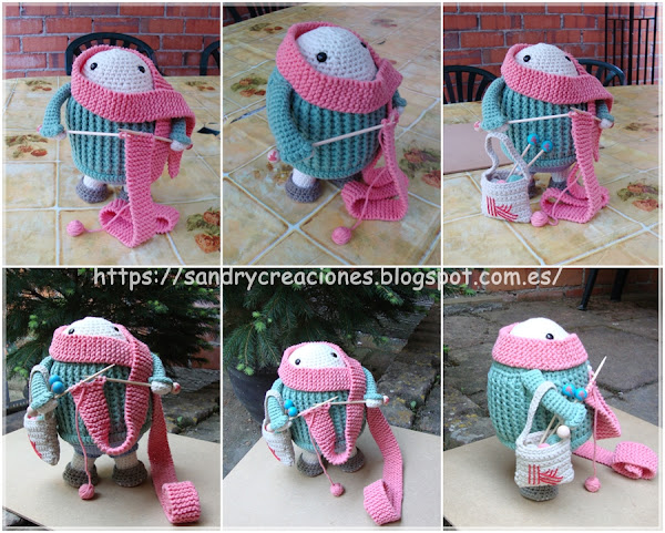 El muñeco llevaba una serie de complementos: una bolsa para llevar sus madejitas de lana, unas agujas de tejer que según el patrón tenían que hacerse con brochetas o palillos y pastas moldeables y una bufanda infinita que aún está tejiendo.
