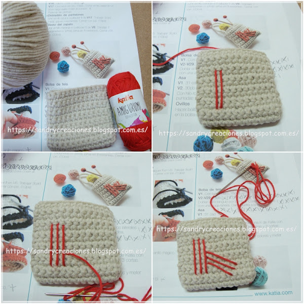 En el blog de Katia te daban el patrón para descargar y la única condición que se daba es que tenía que ser tejido con hilos o lanas de la marca Katia. Yo decidí tejerlo con hilos "Katia Alabama" como se indicaba en el patrón, así que me hice con ellos y empecé a tejer a mi nuevo amigo. También utilicé hilo "Katia Amigurumi" de color rojo para bordar las letras "K" de Katia de la bolsa de Félix y de su gorra.