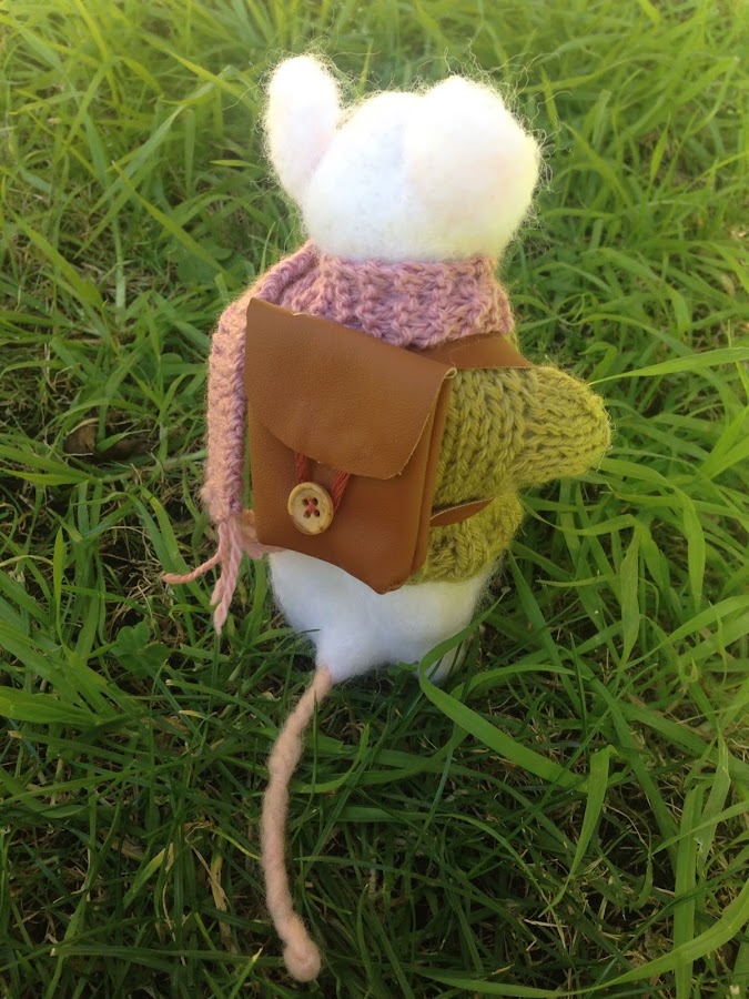 Después de ver muchos vídeos y tutoriales en Internet, aquí está el resultado: Mi ratón Pérez modelado en vellón con aguja. La técnica se conoce también por su nombre en inglés: needle felting ( afieltrado con aguja) y consiste en trabajar una porción de lana de oveja con agujas especiales que cardan la lana hasta que va tomando la forma que queremos darle. Requiere paciencia y tener un poco de sentido del volumen. Aquí están las fotos de Pérez, desnudo y vestido. Por supuesto lleva mochila para recoger el diente y traer la moneda.