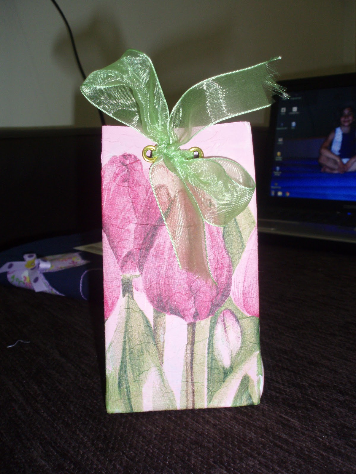 Para mandar la pulsera reciclé un envase de leche, que decoré con decoupage. Una técnica que aprendí de un tutorial que hizo Maribel del blog luzdelunna, nuestra hada de internet.