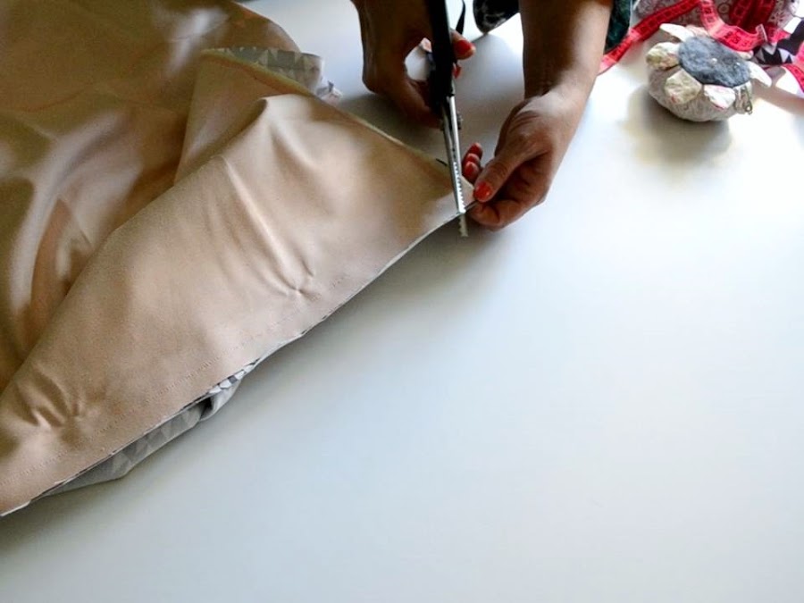 Una vez cortadas pondremos el tejido derecho contra derecho de ambas telas y coseremos todo el contorno del rectángulo excepto un trozo de unos 10-15 cm para dar la vuelta. Y luego cortaremos todo como indico en el vídeo con las tijeras de zig-zag o haremos un pespunte zig-zag, para que no se deshilache el tejido. Cortaremos también las esquinas