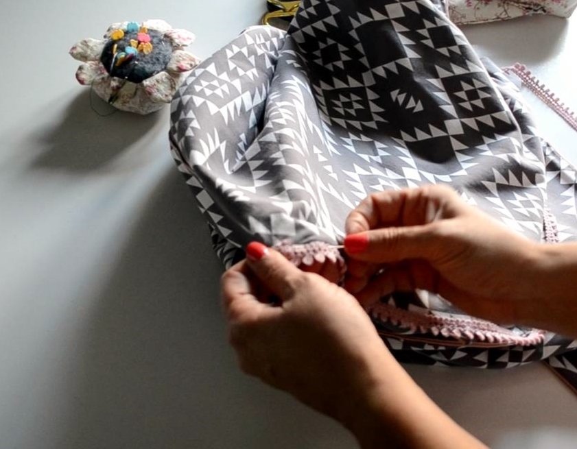Después de estos pespuntes el siguiente paso es poner la cinta decorativa, yo la he puesto por el lado de la tela de jersey navajo, por el lado de la tela vaquera he dejado sin ponerlo. Pero si os gusta podéis hacerlo por los dos lados.
