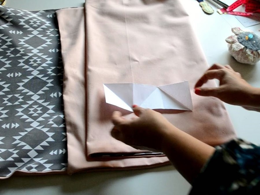 Pero tenemos que imaginar que dividimos la tela en tres cuadrados exactamente iguales y la esquina inferior izquierda la doblamos hacia arriba haciendo un triangulo en el primer cuadrado, la esquina superior derecha la doblamos hacia abajo y hacemos un triangulo en el tercer cuadrado y con el cuadrado del centro hacemos otro triangulo y con esto tendríamos nuestro bolso, ahora tendremos que unir las costuras.